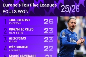 體育資訊10月17日訊 25/26賽季歐洲五大聯(lián)賽中被犯規(guī)次數(shù)排名出爐,來(lái)自埃弗頓的格拉利什以26次位居第一。