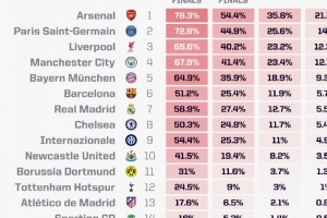 體育資訊10月23日訊 歐冠聯(lián)賽階段第三輪比賽戰(zhàn)罷,Opta超級計算機(jī)更新了各隊(duì)的奪冠概率,阿森納21.13%最高,巴黎、利物浦二三位。