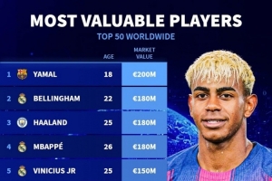 體育資訊10月25日訊 德國(guó)轉(zhuǎn)會(huì)市場(chǎng)列出了球員身價(jià)前50排名,亞馬爾2億歐居首,貝林厄姆、哈蘭德、姆巴佩1.8億歐次席。