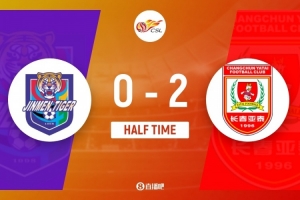 傷停補(bǔ)時(shí)4分鐘。上半場比賽結(jié)束,天津津門虎0-2長春亞泰。